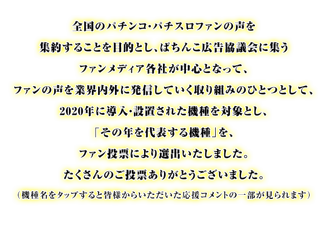 2020はスロットでは6号機が規制の中試行錯誤するも5号機が現存する現状いまいち伸び悩み、パチンコではP機、遊タイムと単純な出玉面だけではなく、時速の速さから時間を気にせず打てる台、遊タイムによって期待値が見えやすくなることで狙いが増えたこと、ミドルタイプでも打ちやすいスペックなど遊技の幅が格段に広がりました。