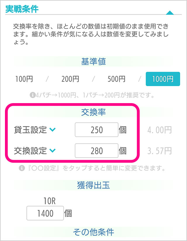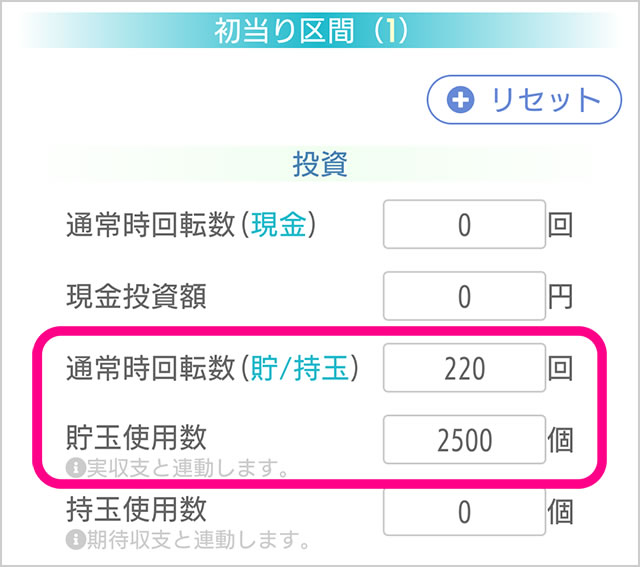 最初に投資の項目を入力します。上記の例では通常時220回転目に大当りし、貯玉を2500個使用した場合です。