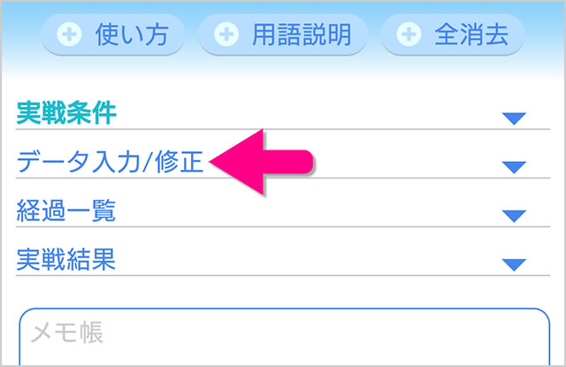 『実戦条件』の下にある『データ入力/修正』部分をタップすると、下記の画面が表示されます。