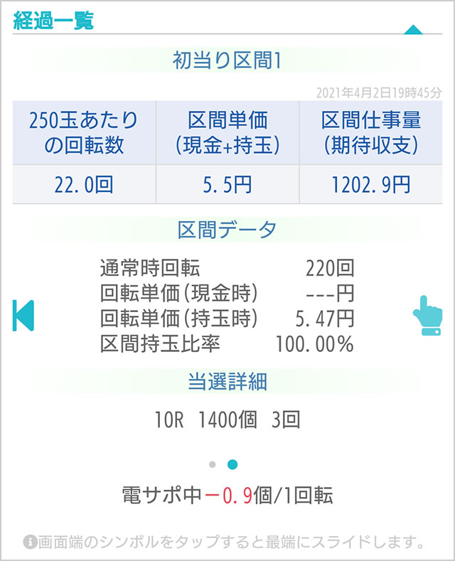 最後に連チャンが終了したら、下部の『区間データを追加』ボタンをタップします。すると『経過一覧』(下記画像)が自動的に表示されます。