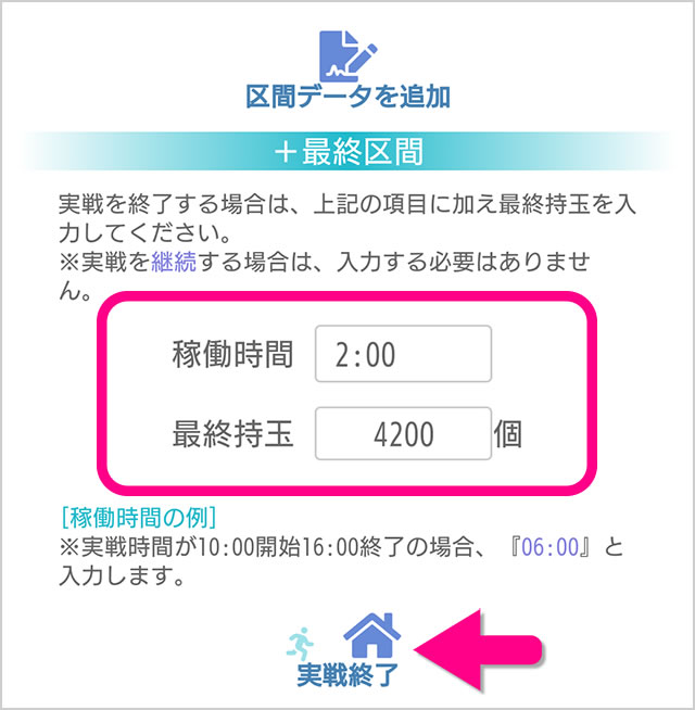 上記Aのデータに加え『稼働時間』と『最終持玉』を入力します。