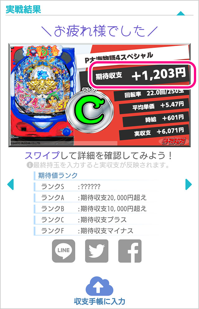 『収支手帳に入力』をタップすると、要約された実戦データが